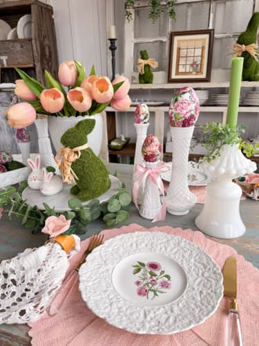 Adding a vintage cake plate to your table centerpiece can add an elegant touch. The plate’s translucent glass serves as a creative complement to any centerpiece. This Easter inspired tablescape includes a large milk glass vase with tulips and a moss bunny on the cake plate and is surrounded by vintage bud vases with decoupage Easter eggs. See all the Spring & Summer Milk Glass Centerpiece Ideas for more inspiration.