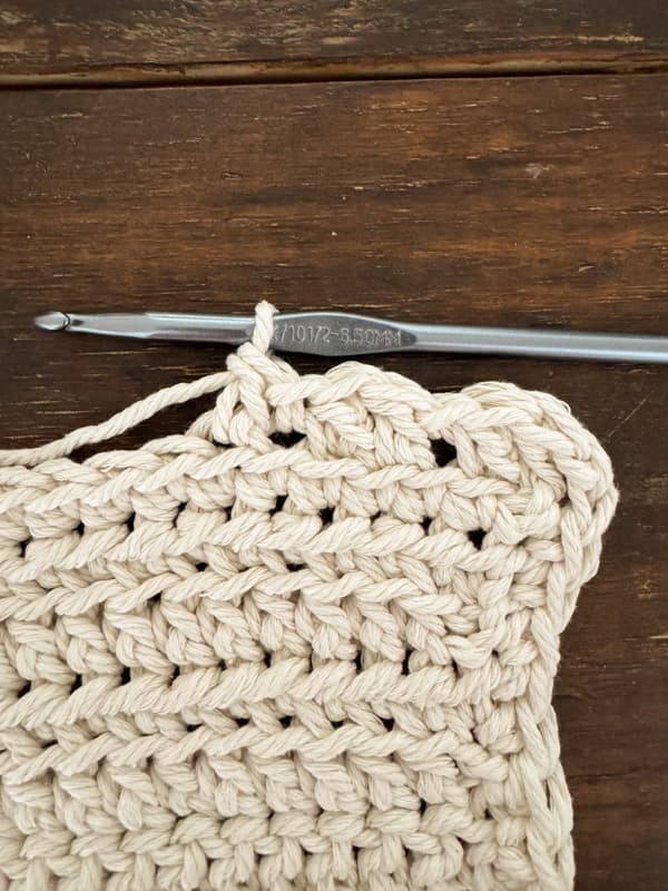 Step 9 – When you get to the end of the sc row, chain 2 and skip the first stitch on that side.