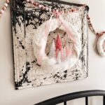A trio of Easy Pink Bottle Brush Tree Wreaths hang on the bed on a vintage ceiling tin for a whimsical holiday look.